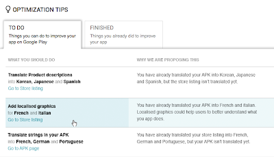 The new optimization tips for localization will help you identify new potential opportunities for global expansion based on popular languages for your app's users and category. To fully localize your app into a language, you need to translate the strings in an APK, translate your Google Play store listing, and upload localized graphics. The optimization tips will also let you know if you're missing any of these pieces.